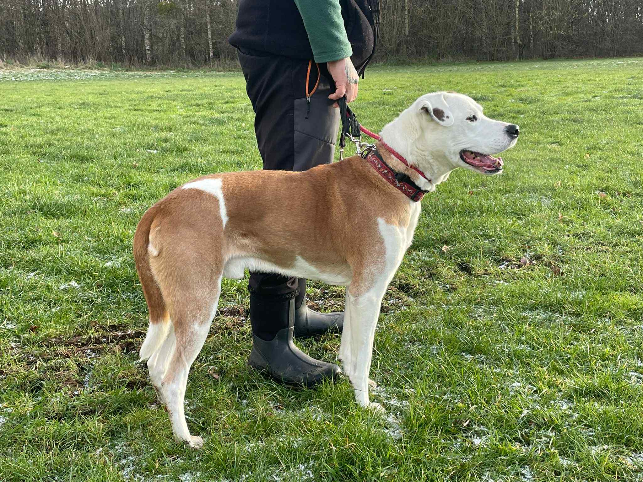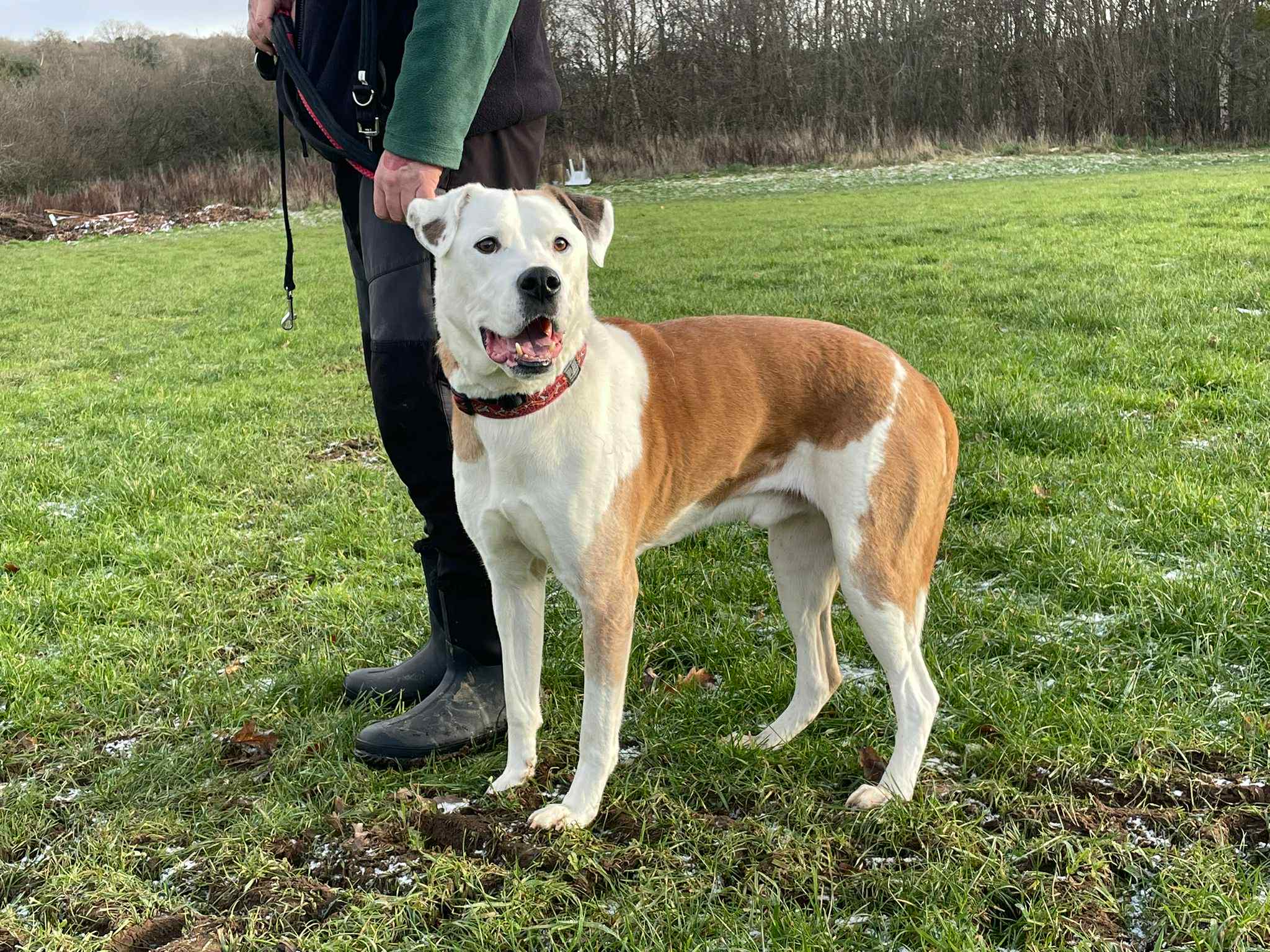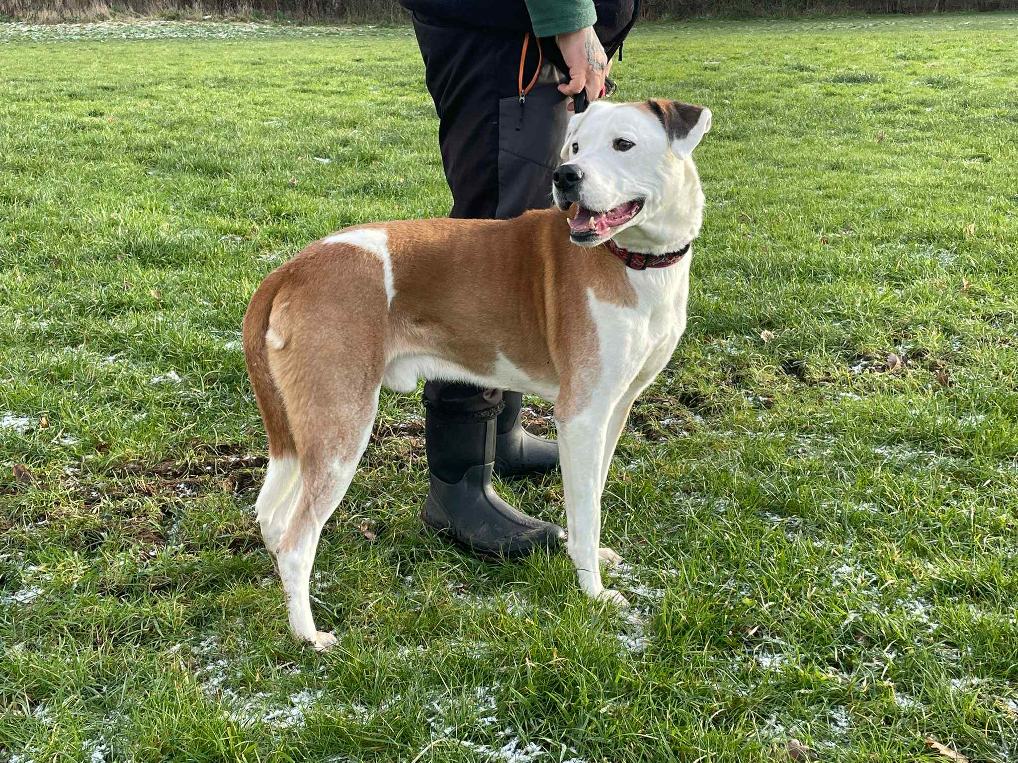 On the lead he is walking so much better on a Gencon head collar, he may well need an owner who is physically strong enough to hold him should he decide to pull as he is a big dog and as such can be strong but on the whole he does walk really well.